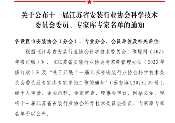 江蘇省安裝行業(yè)協(xié)會(huì)公布了十一屆江蘇省安裝行業(yè)協(xié)會(huì)科學(xué)技術(shù)委員會(huì)委員、專家?guī)鞂<颐麊?,我司多名人員榜上有名。